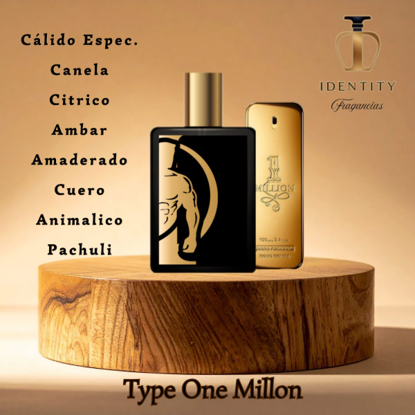 Una fragancia icónica, audaz y extremadamente seductora. Type One Million destaca por su mezcla dulce-especiada con un fondo cálido que genera una estela poderosa y muy reconocible.